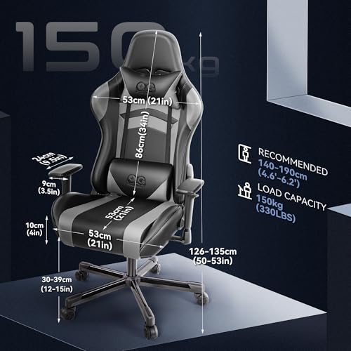 OneGame Black Gaming Chair for Adults, Ergonomic Computer Chair, Height Adjustable Game Chair, Racing Style Gamer Chair with Headrest and Lumbar Support, Black Gray