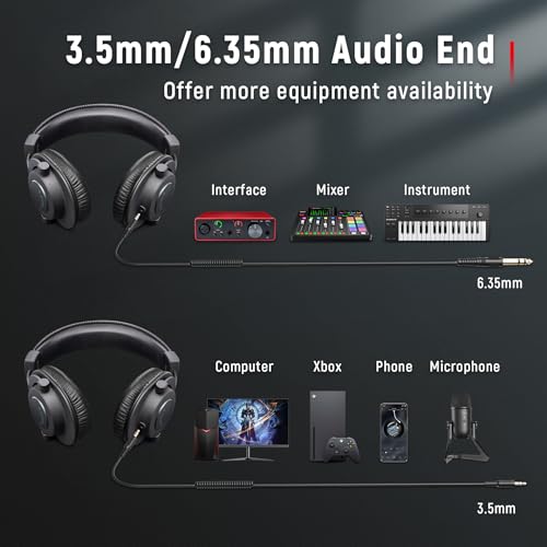 [EXTENSIVE COMPATIBILITY] The over ear headphones wired expand the efficiency of your devices. Two 9.8ft detachable DJ-style coiled cables with 3.5mm and 1/4’’ audio plug ensure a wide-ranged of connection with mixer, audio interface, amp and mic with headphones jack. No extra adaptor is required for the over-ear headphones when switching different devices for a improving monitoring productivity.